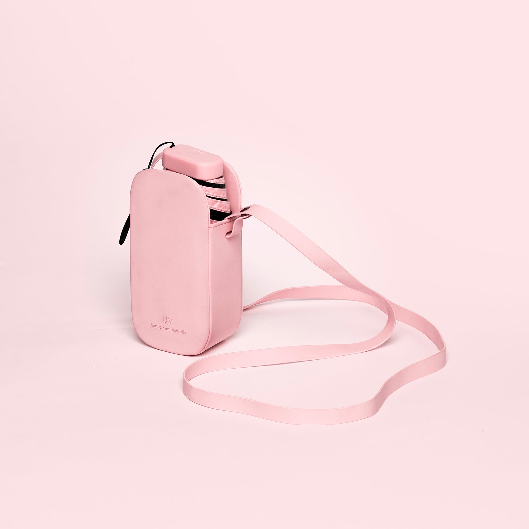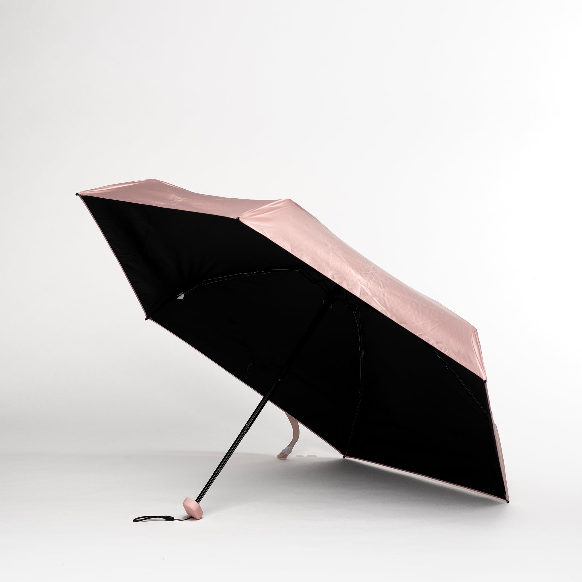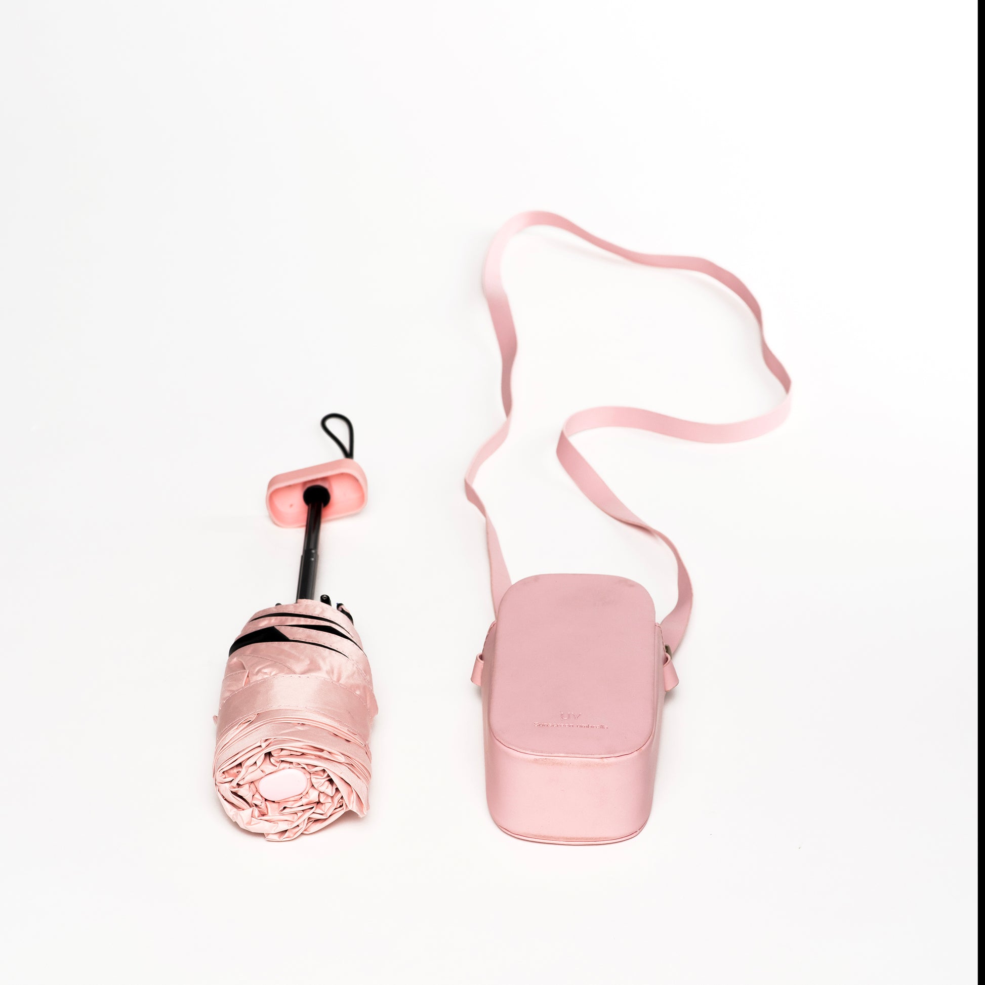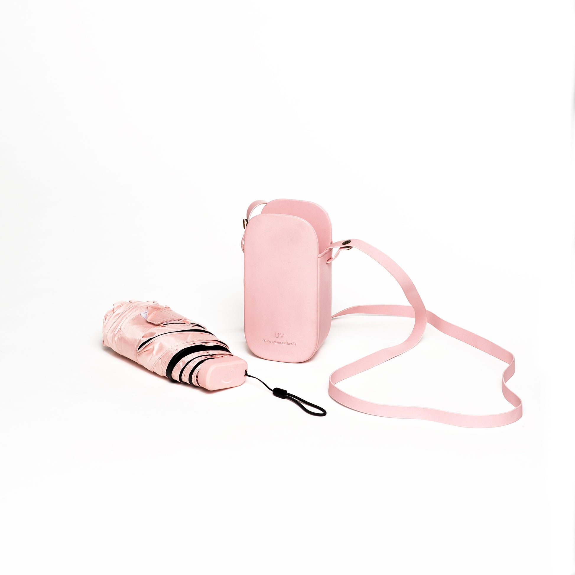 Experience fashion and function with Peachy Skies - The Sling Edition. This light weight, peachy pink umbrella not only adds a pop of color to any outfit, but also provides practical protection from the elements. A must-have accessory for those who want to make a statement while staying dry.